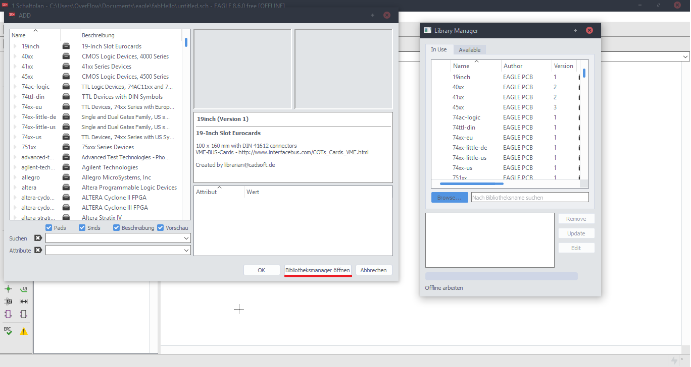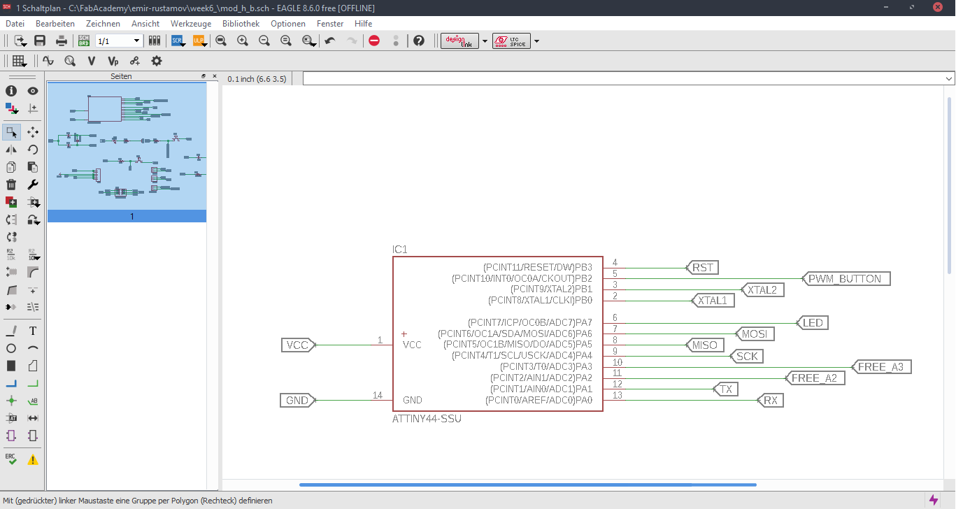 ATtiny 44The microcontroller that we have to work with is ATtiny 44. We have already used it 1 Week ago for the FabISPLibraryIn order to work properly, have to download and use special Libraries. Eagle has a a huge amount of build in libraries that we can use. I my case, I have used Fab Academy Libraries. After you forward the link, you have to choose, the program you are working with and than download the proper Library.Eagle SchematicEagle has two windows that are used simultaneously to design a board: