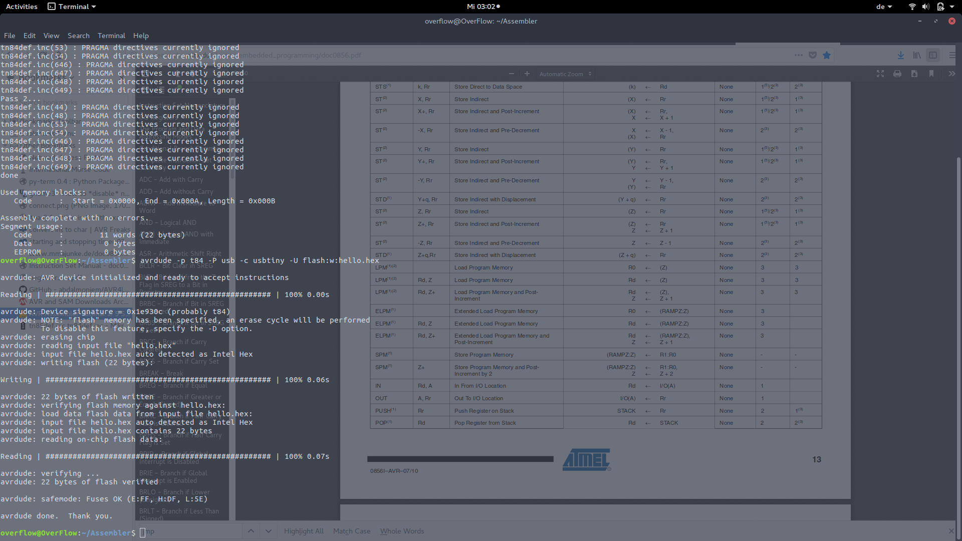 overflow@OverFlow:~/Assembler$ avrdude -p t84 -P usb -c usbtiny -U flash:w:hello.hex