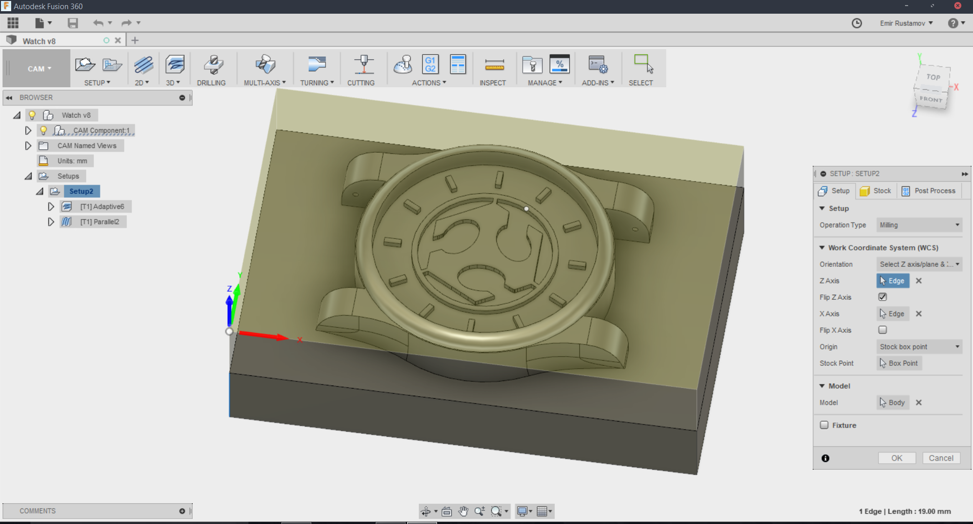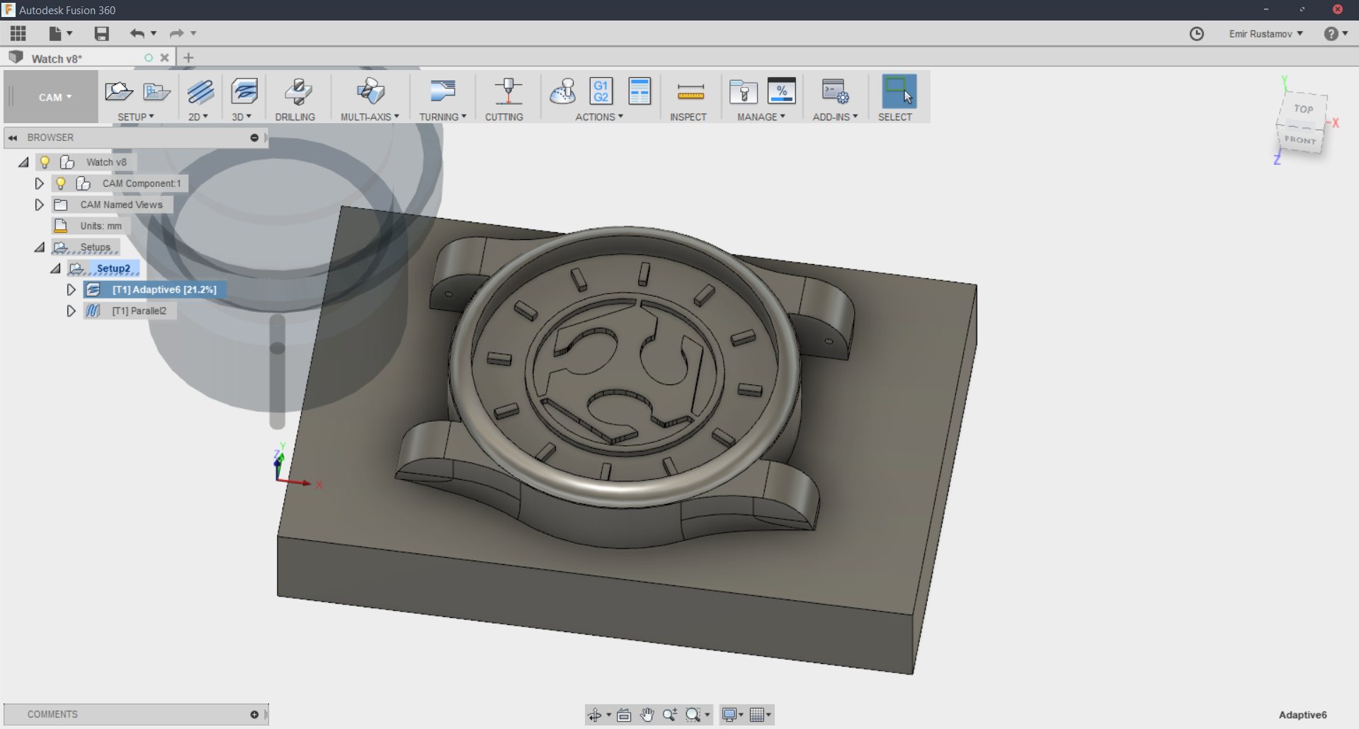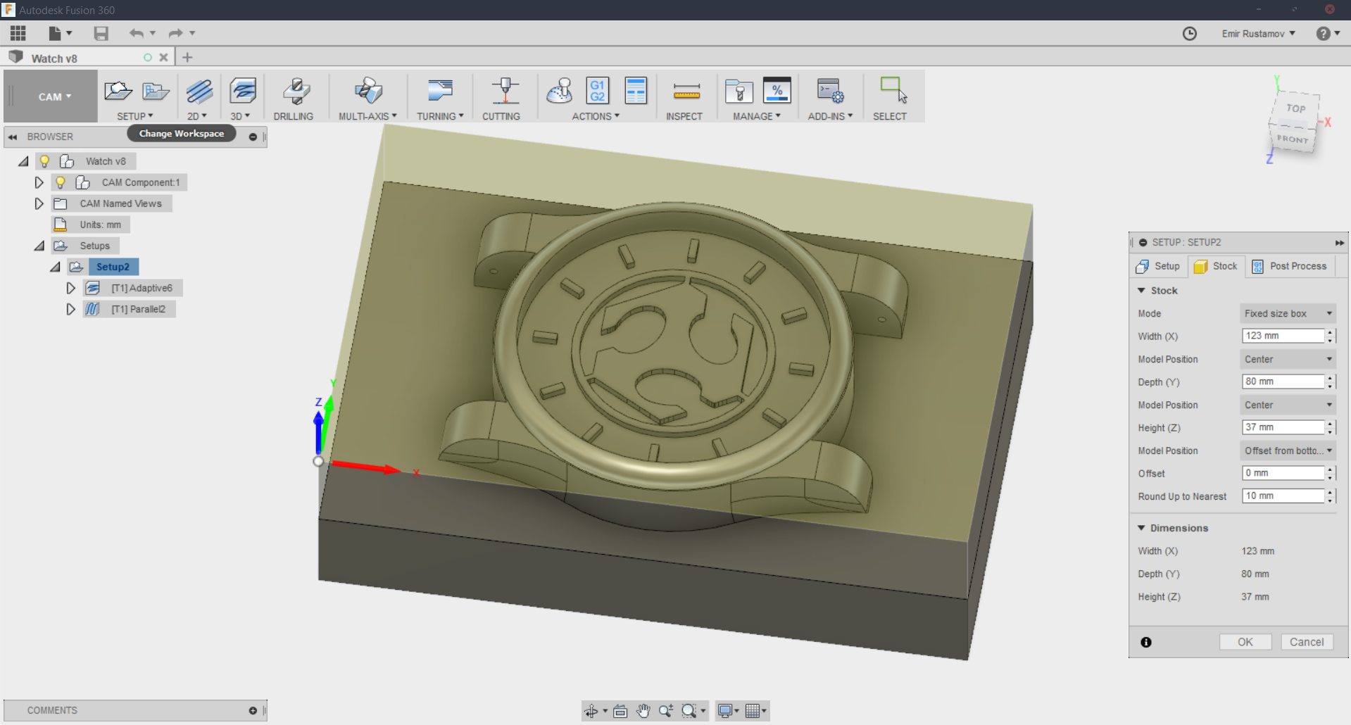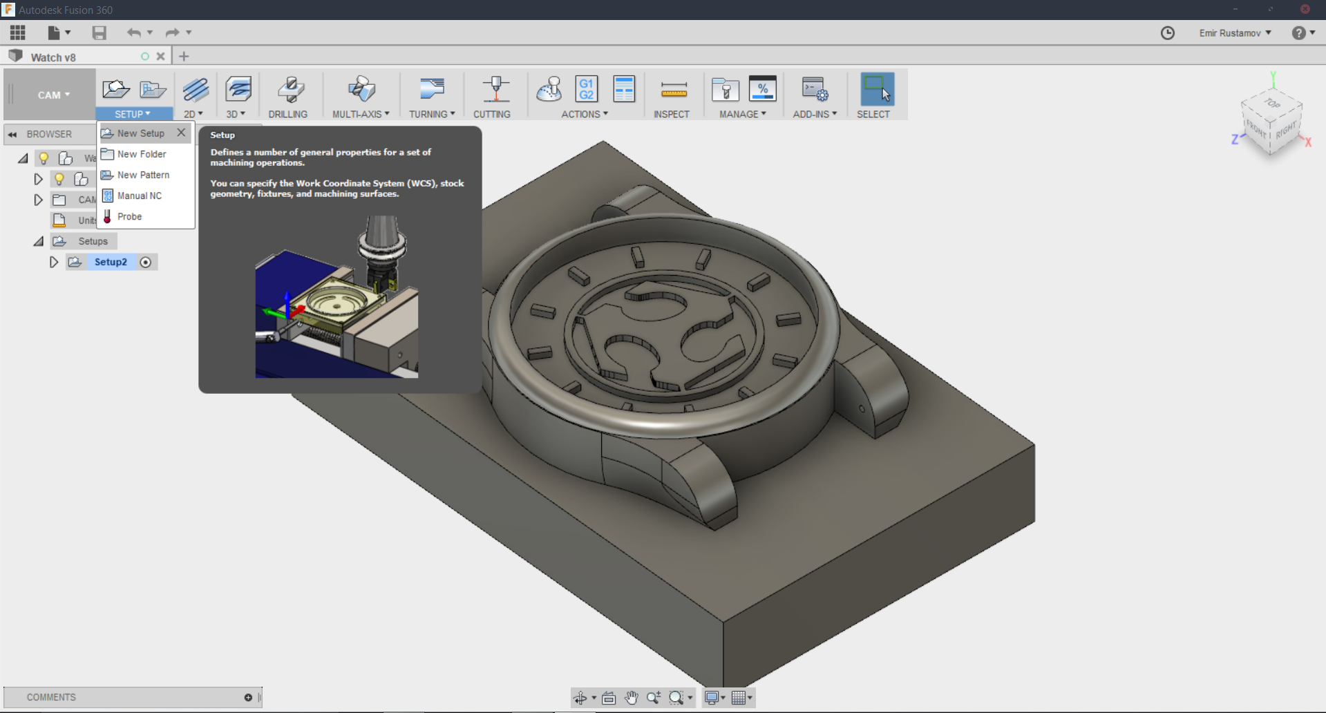 3D ModelWell this is my model, that i have made for this week, it is a Watch.This is how I have designed the watch.Okay, after we have our model, we have to cut it with the CNC machine, in my Case it is a Roland MDX-40a. To do this we need a GCode -> therefore we need to go to the CAM Workspace.At the beginning, we don't have setup, so we create one.Setup settings-The operation type is milling