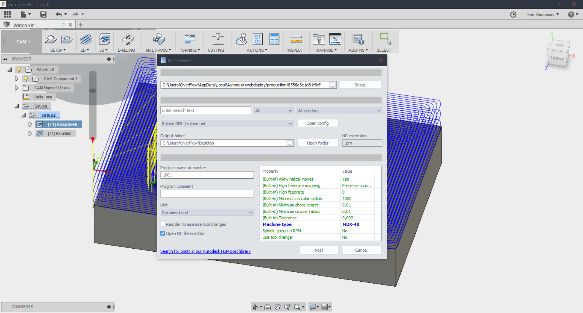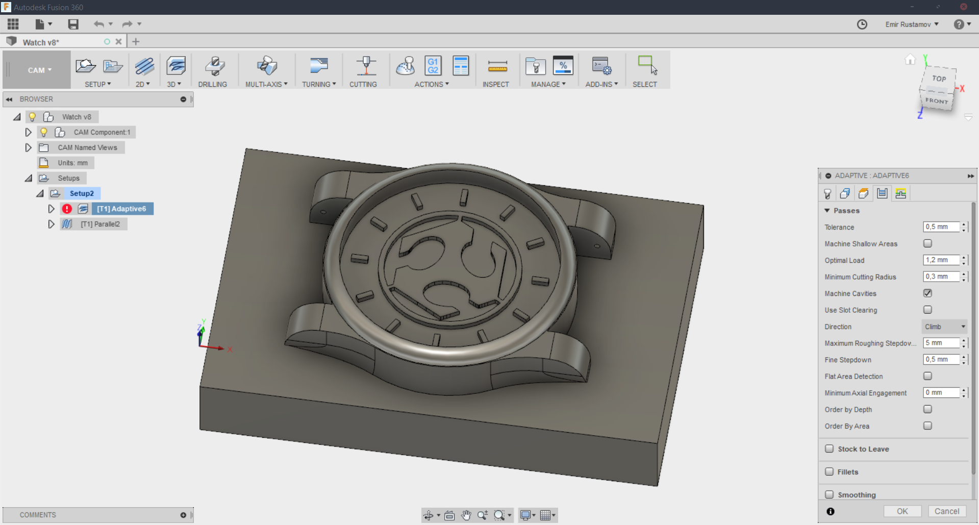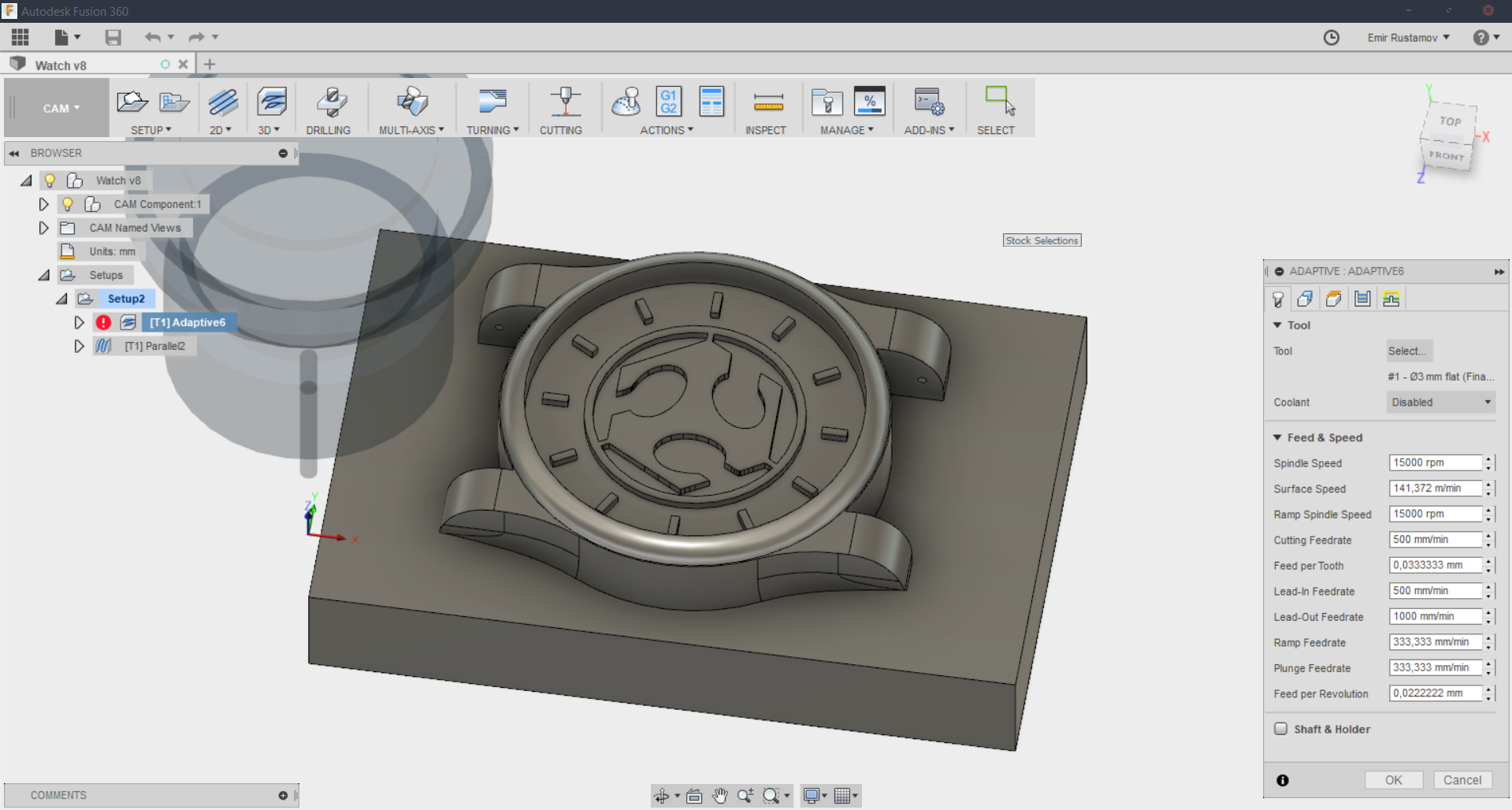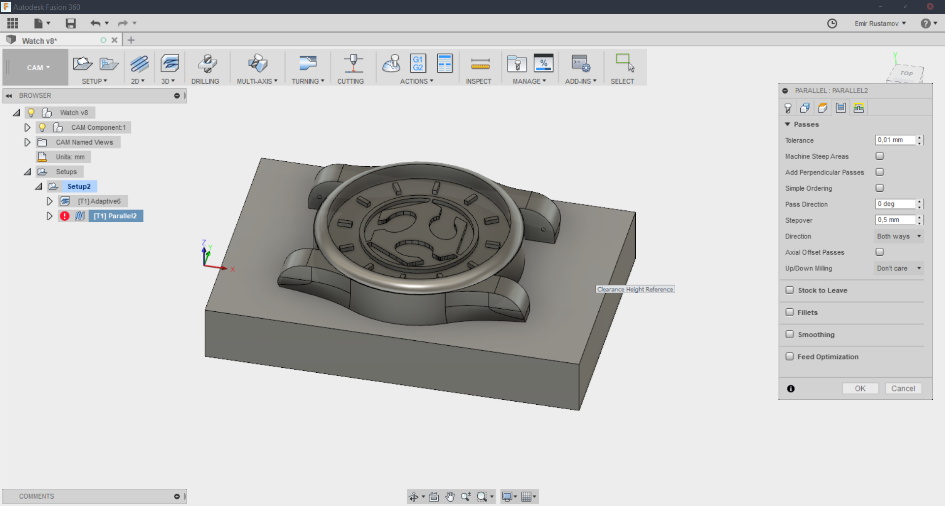 3D ModelWell this is my model, that i have made for this week, it is a Watch.This is how I have designed the watch.Okay, after we have our model, we have to cut it with the CNC machine, in my Case it is a Roland MDX-40a. To do this we need a GCode -> therefore we need to go to the CAM Workspace.At the beginning, we don't have setup, so we create one.Setup settings-The operation type is milling