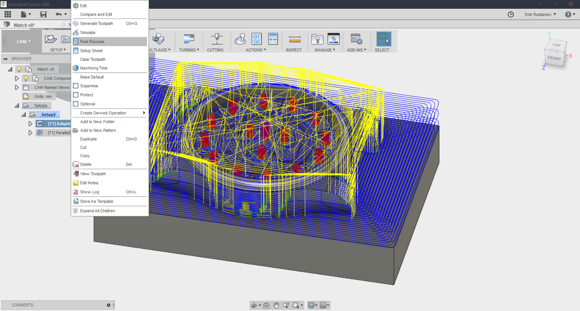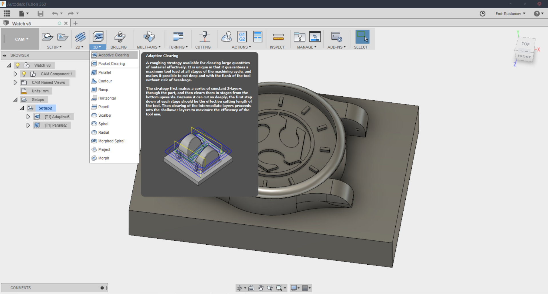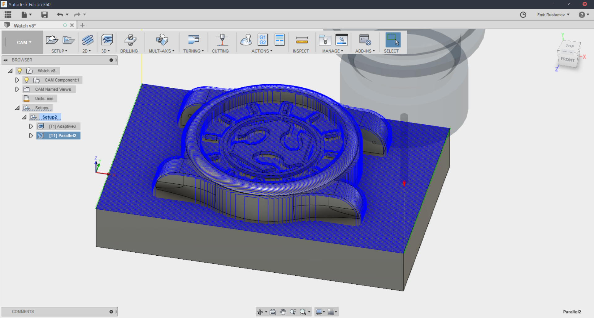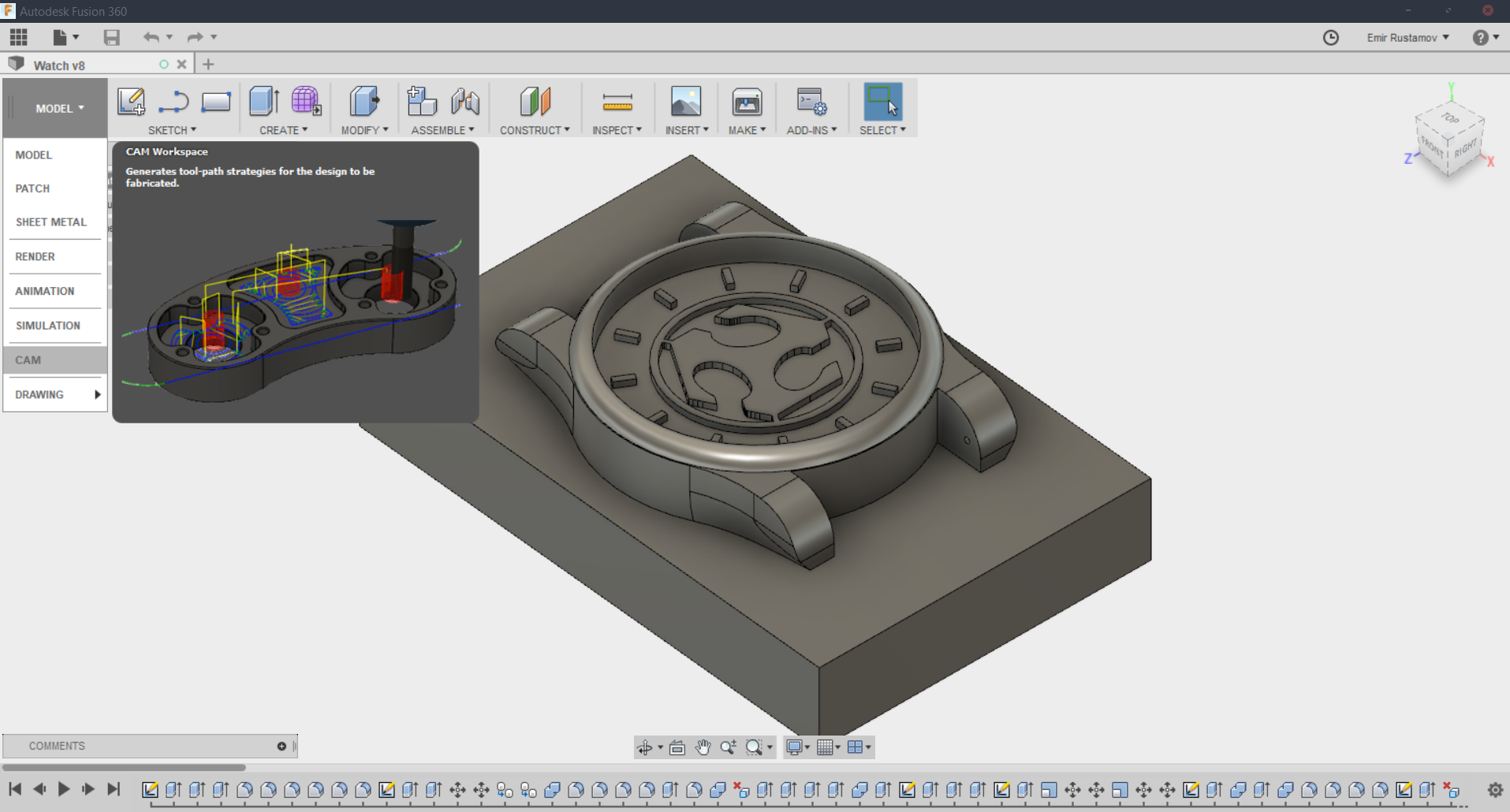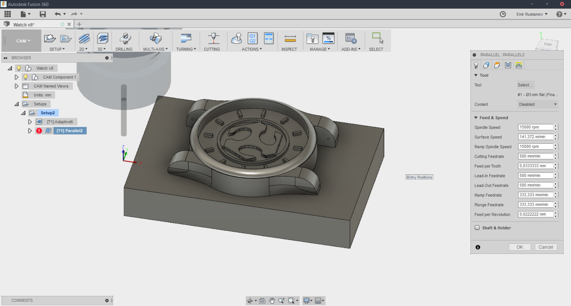 3D ModelWell this is my model, that i have made for this week, it is a Watch.This is how I have designed the watch.Okay, after we have our model, we have to cut it with the CNC machine, in my Case it is a Roland MDX-40a. To do this we need a GCode -> therefore we need to go to the CAM Workspace.At the beginning, we don't have setup, so we create one.Setup settings-The operation type is milling