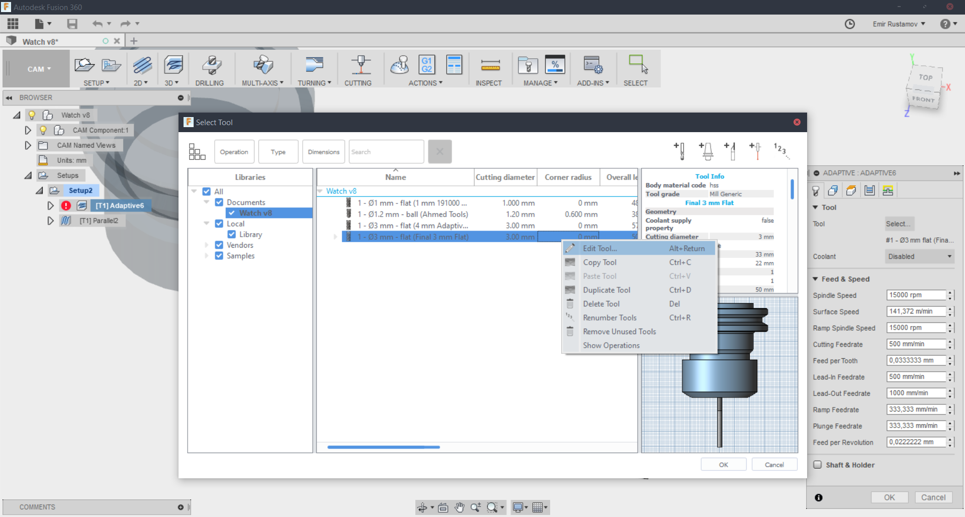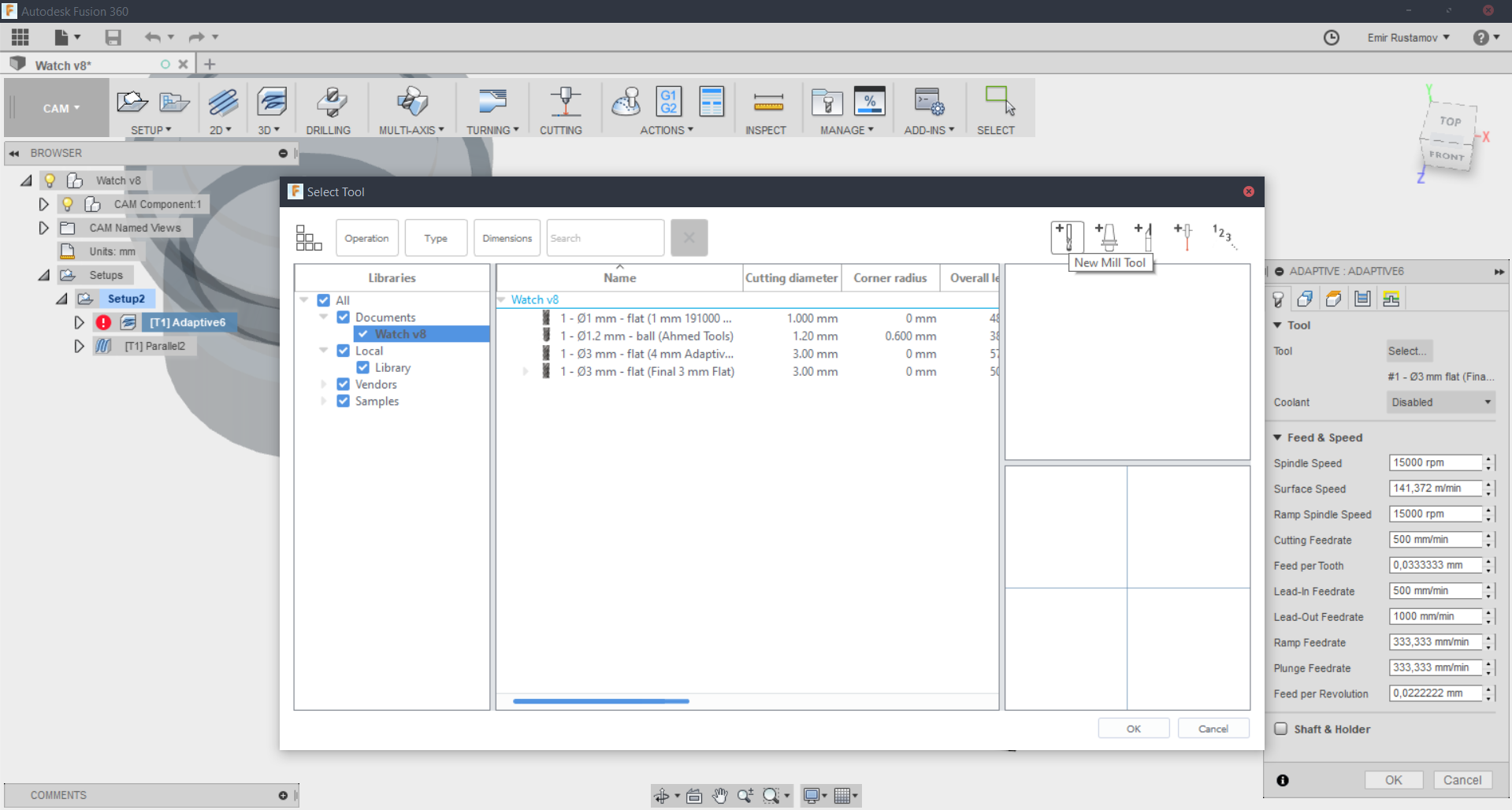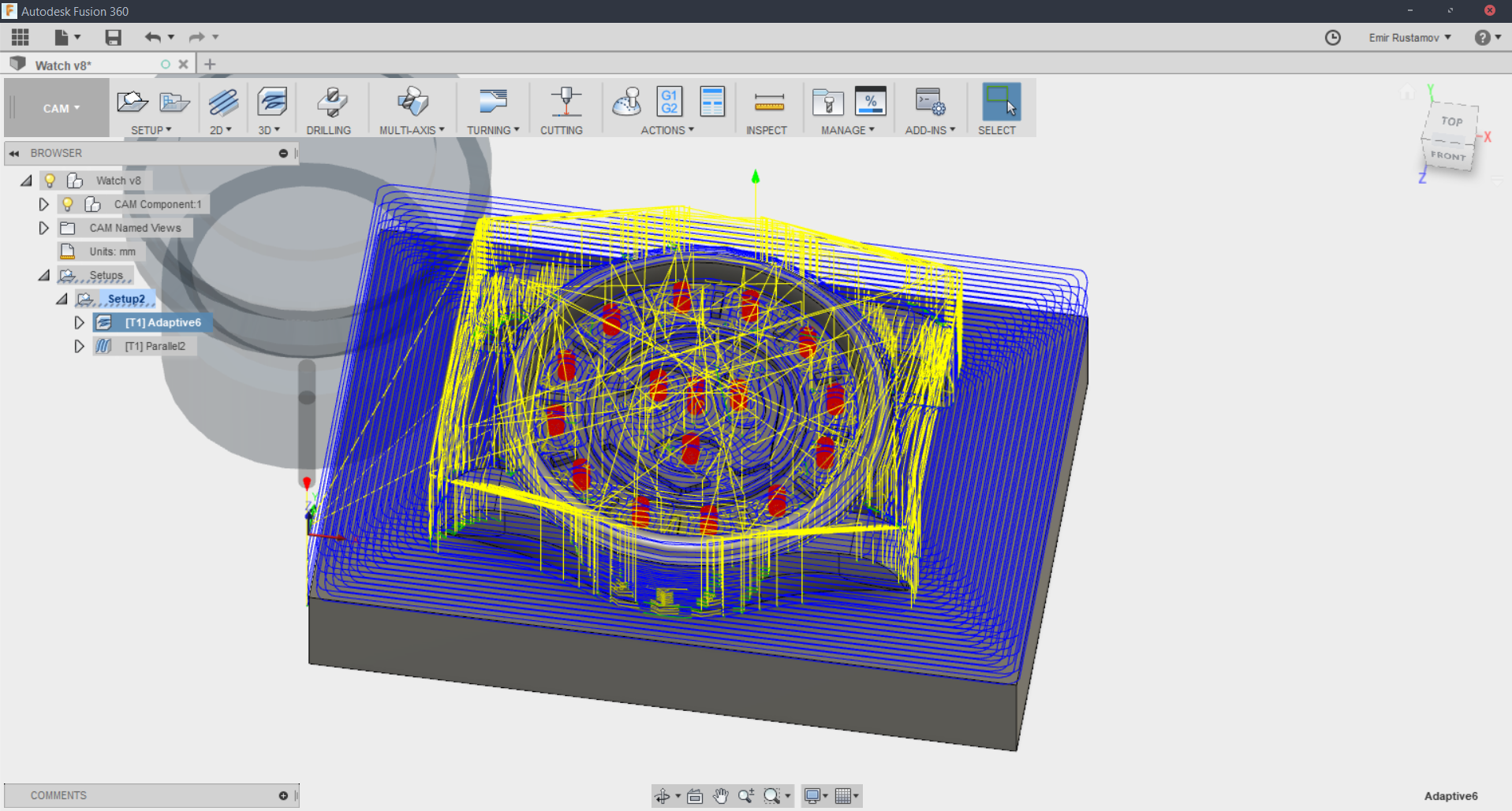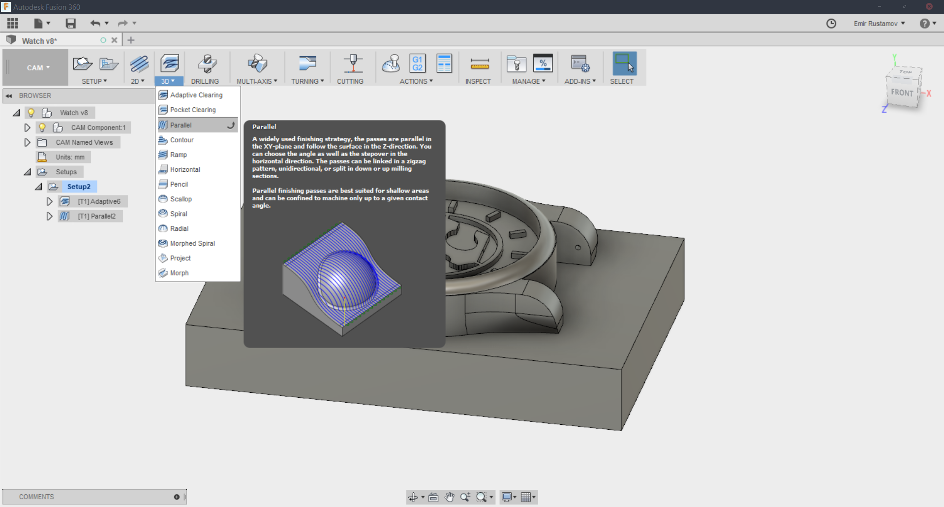 3D ModelWell this is my model, that i have made for this week, it is a Watch.This is how I have designed the watch.Okay, after we have our model, we have to cut it with the CNC machine, in my Case it is a Roland MDX-40a. To do this we need a GCode -> therefore we need to go to the CAM Workspace.At the beginning, we don't have setup, so we create one.Setup settings-The operation type is milling