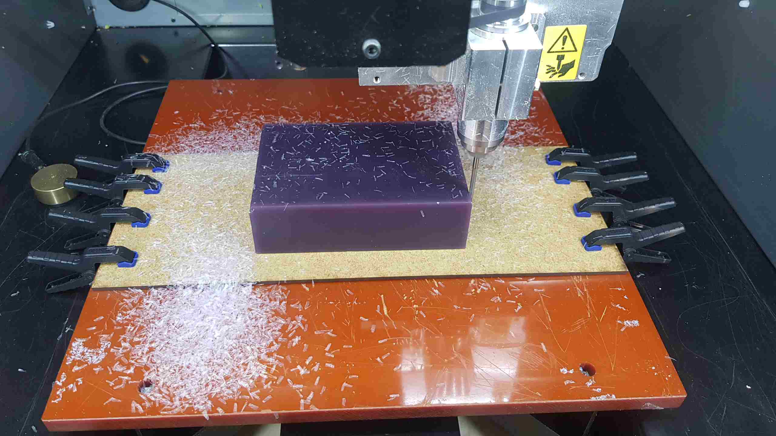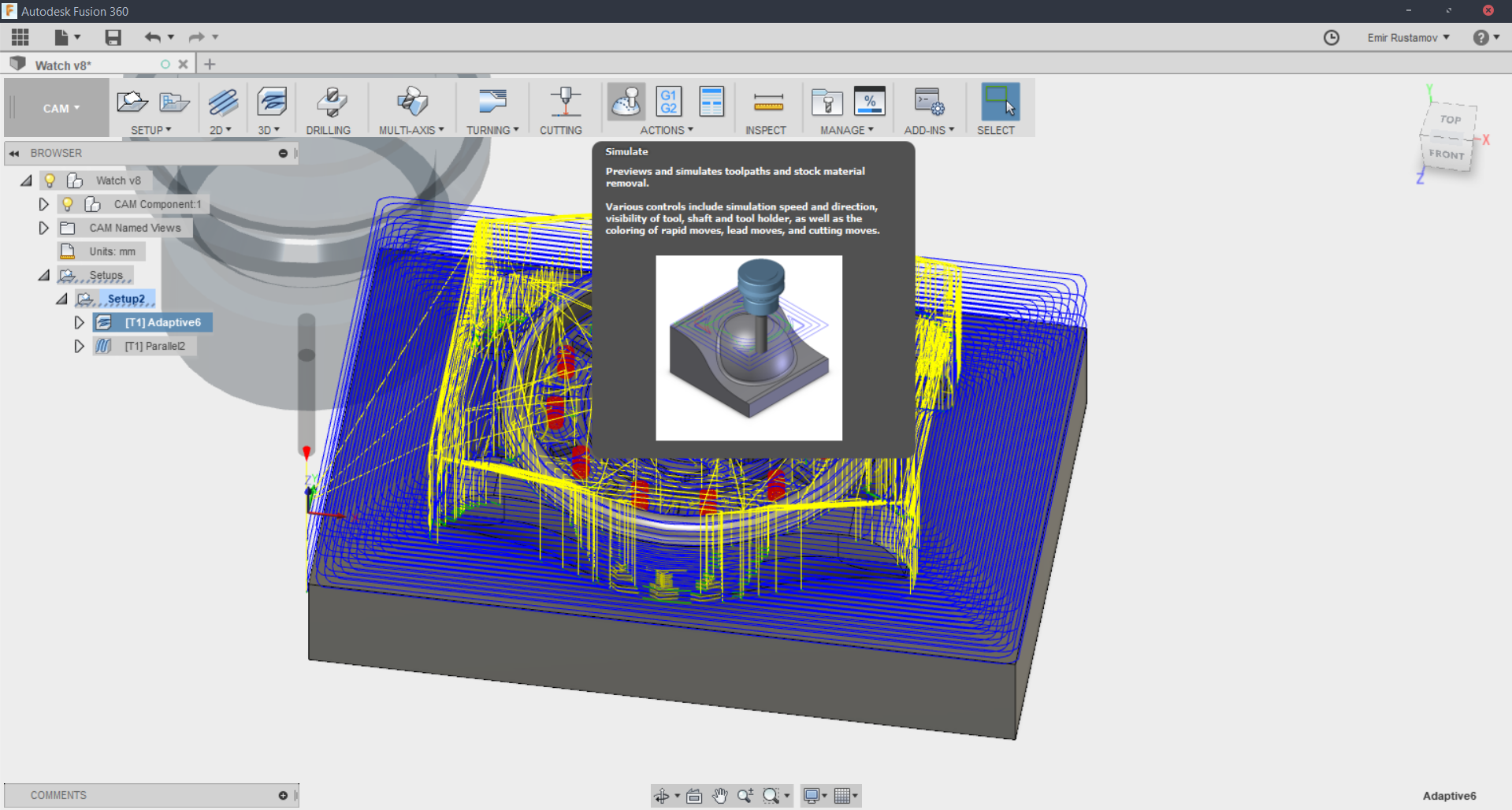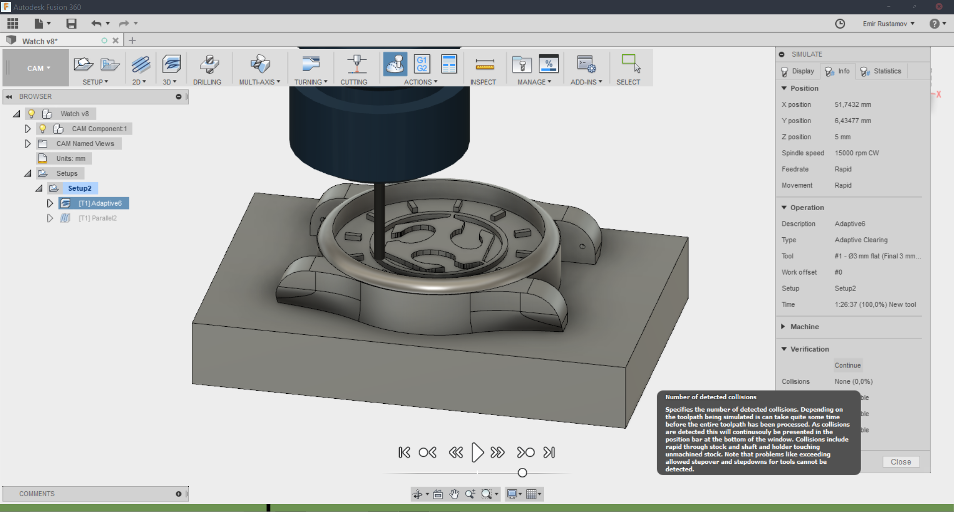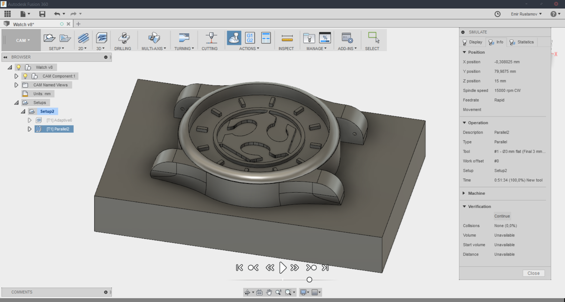 Red: Plunging SimulationNow we can Simulate the job, with the button above.This is how it works. Here you can disable and enable the toolpath and the stock, for the better overviewNow in the simulation, we can see the amout of the collisions, if they exist. It is ofcourse better, if there is no collisions.Parallel ClearingWell I made the finishing cut, with the parallel clearingSettings for the Parallel ClearingBut here we have to change the Tolerance to 0.01mm, because it is a final cut.Here how the parallel clearing looks like after the generated toolpathAgain, it is important to have no collisions.After we have finisched will all this settings, we have to post the process.Here we have to choose the proper Machine and Machine type.Milling ProcessAfter some timeAnd now the finishing CutDone Millig ProcessesMoldingOkay, now we have to make a case for our stock, so that me can pour the proper liquid, and be sure that are no leaks.