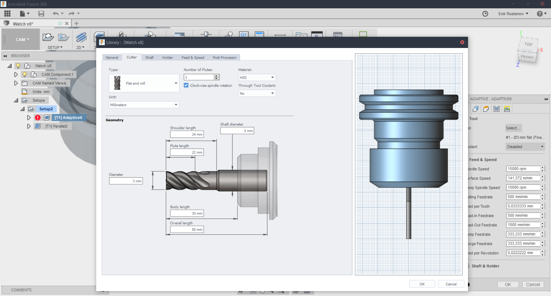 -And than set the Stock Point accortinng to the Zeropoint of the CNC machine in the future.Here we define the size of our stockOkay, now the have to add the milling techniquesToolOkay, first of all we have to select a toolWith the button above we can add some tool, if we don't have any.Or we can change the tool, that we already have. This is very usefull, we Here we have to measure our tool and enter the values. But be carefull, we can not determine the bodylength of the tool, until, it is in the collet.Now we will take a look to some parameters. That can be usefull(in my opinion)