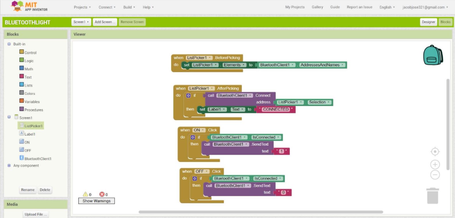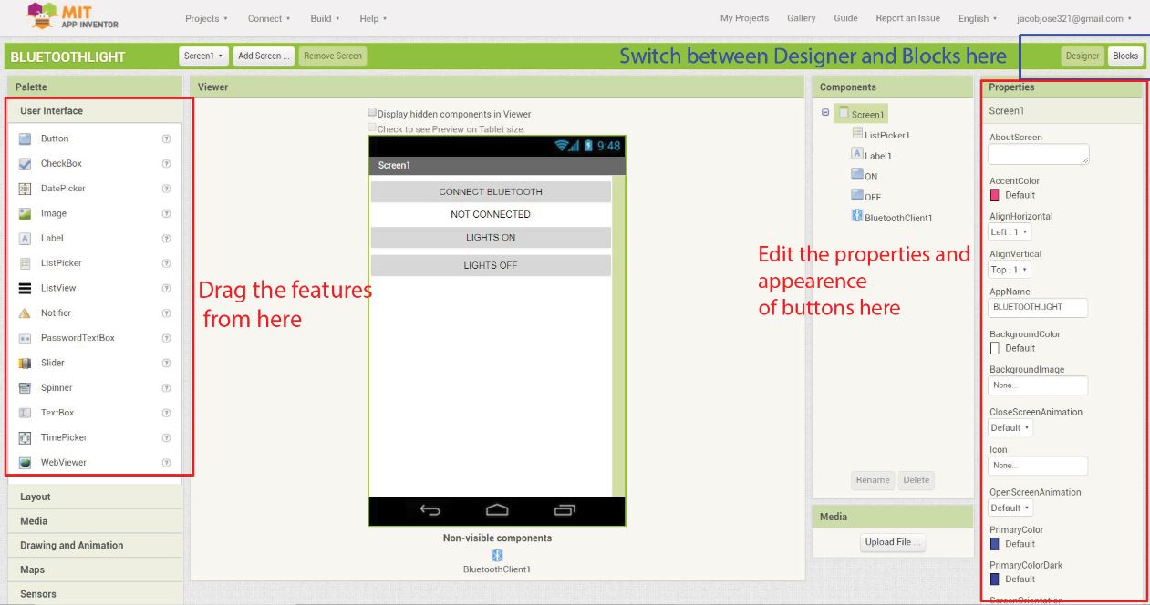 To start using the MIT App Inventor we have to first go to http://ai2.appinventor.mit.edu and login with our gmail account.As mentioned earlier we have two main parts called Designer and Block to start making our app. In our designer part we can speacify the overall outlook of our app. We can determine the color shape and other details of the user interface. In my case I had mainly 3 buttons LIGHTS ON , LIGHTS OFF and CONNECT BLUETOOTH. We can simply drag and drop these buttons and edit the details to our required speacifications. I used Listpicker to list all the bluetooth devices and LIGHT buttons to control them.