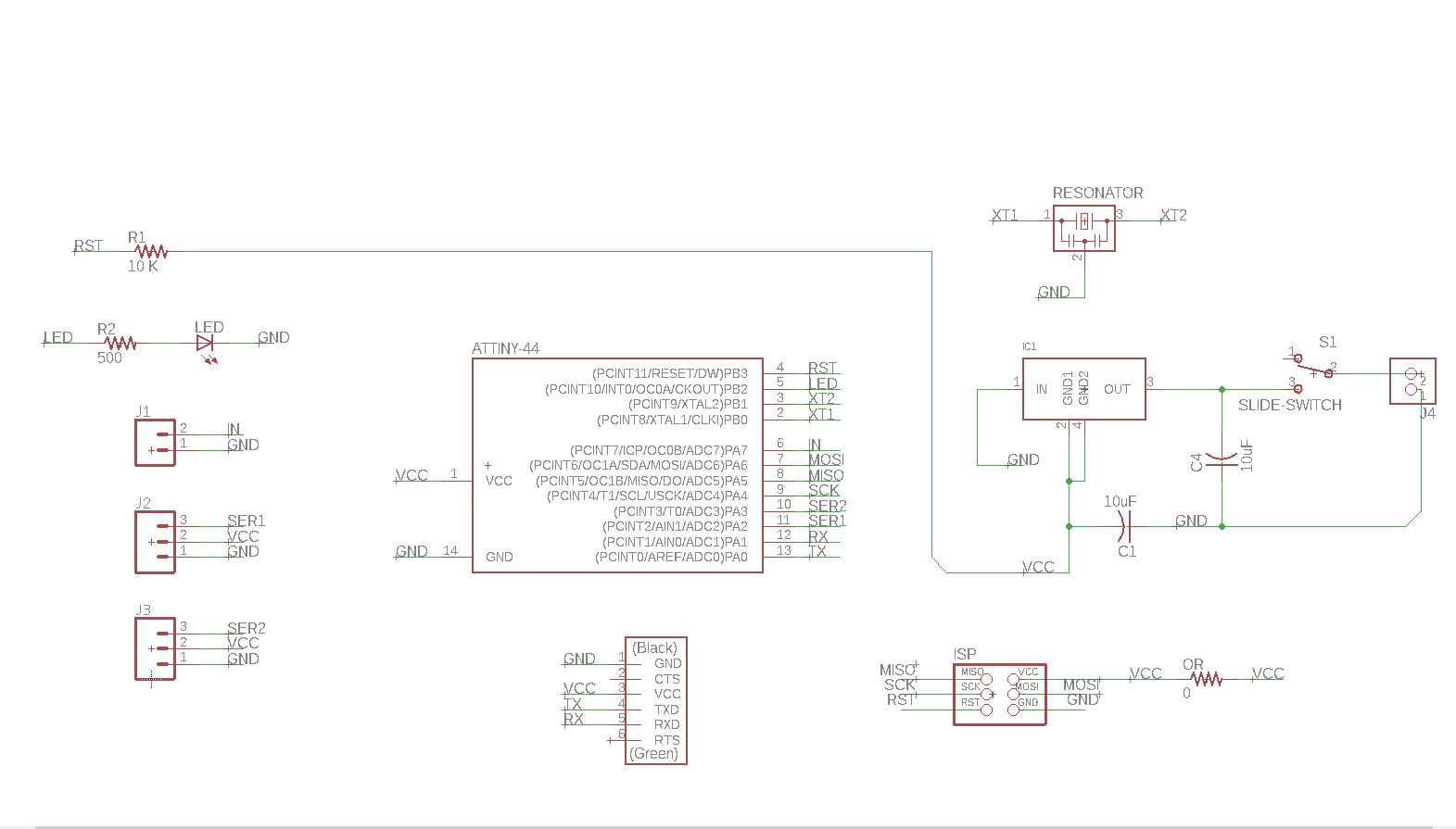 I used Attiny 44 in this board So I'll have to use the software servo to control the servos.I also added 20 Mhz resonator,A voltage regulator to provide external supply ,LEd and SLide switch.