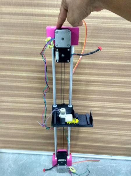 The end effector should have a mechanism within itself to retrieve and supply the components. We designed a simple rack and pinion system for this purpose which could be easily lasercut and could be operated using a simple geared mini motor.This one also holds the provision to attach the timing belts.