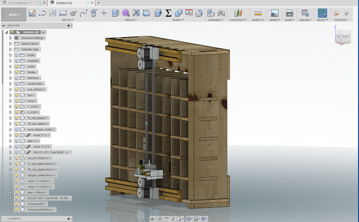 And we came up with a half rail based and half belt driven system intead of a completely belt driven system.The idea was to use maximum components from inventory and we only had a small piece of the timing belt left in our lab. Also, there could be a some vertical force on the belts as well, due to the weight of the end effector module.So we thought to use a rail system for the horizontal movement. Before designing one overselves we first refered many rail systems and mechaniacl systems developed in Fablab.We really liked the Chamfered Rail System and Core[X,Y] system . Chamfered rail system require shopbot to mill the components and was time consuming. So we made a design which could be easily manufactured using laser cutting process.