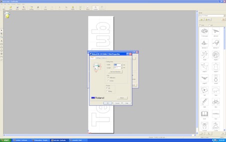 Next I press the "Print" icon and select "Roland GX-24" from the pull-down box. Next, I press properties, and enter values for cutting area which match what the Roland generated for the vinyl stock. In my case, the dimensions were 56.6mm width and 261.3. Note: If your desktop is directly connected to the cutter, you can press the "Get from Machine" button. If your cutter is networked, this button does not work.