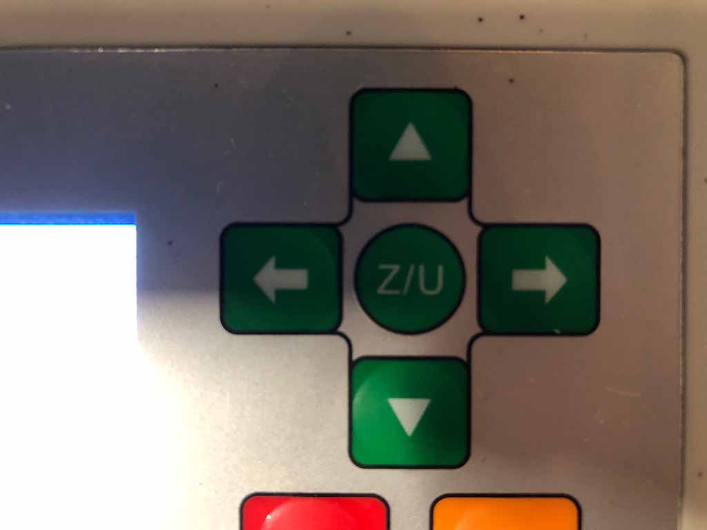 I place the plywood onto the honeycomb bed. Next I will use the keypad on the machine to move the table up until it is 20mm from the part. I like using the manual method of focus rather than auto-focus.
