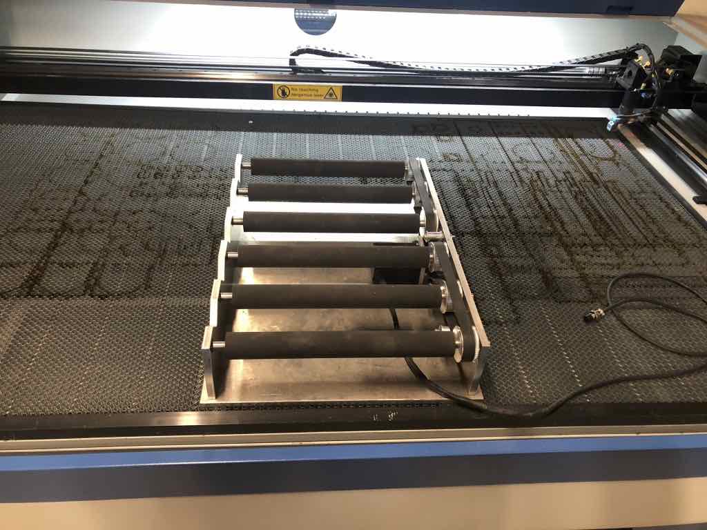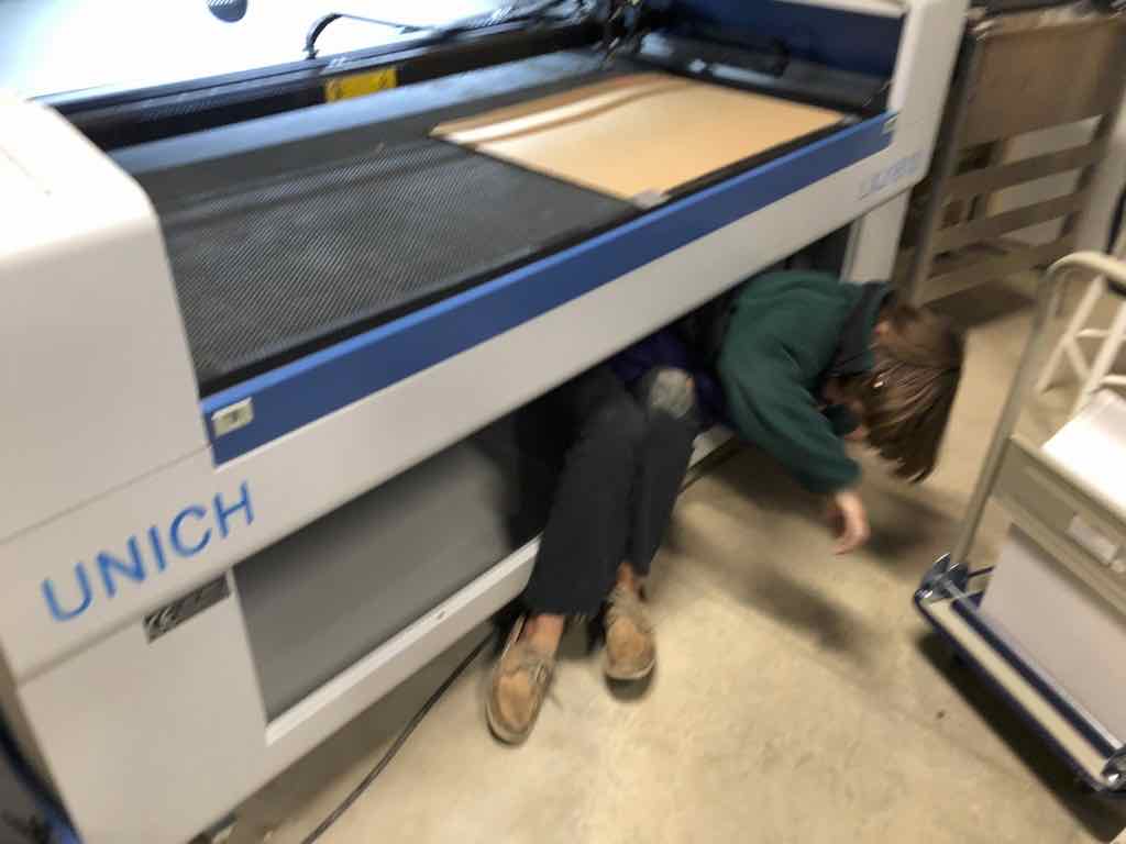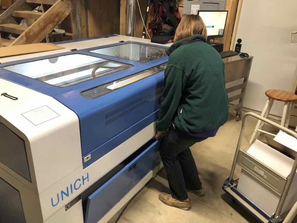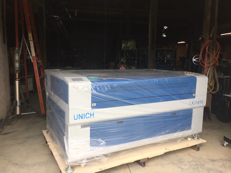This is a Unich LXJ1610. I unloaded the machine with my Caterpillar 6000 pound capacity telehandler and placed it inside my workshop. Once I uncrated the machine, I was able to roll it about the workshop with built-in casters. Blower, laser tube, chiller, compressor, single-bottle rotary and 5-bottle rotary attachment were all packed inside neatly inside the machine. I purchased it for the workshop at my winery, and to avoid the long drive to LCCC and the long wait for Matilda. It seems that laser cutters are the most popular resource at the various FabLabs I have visited.