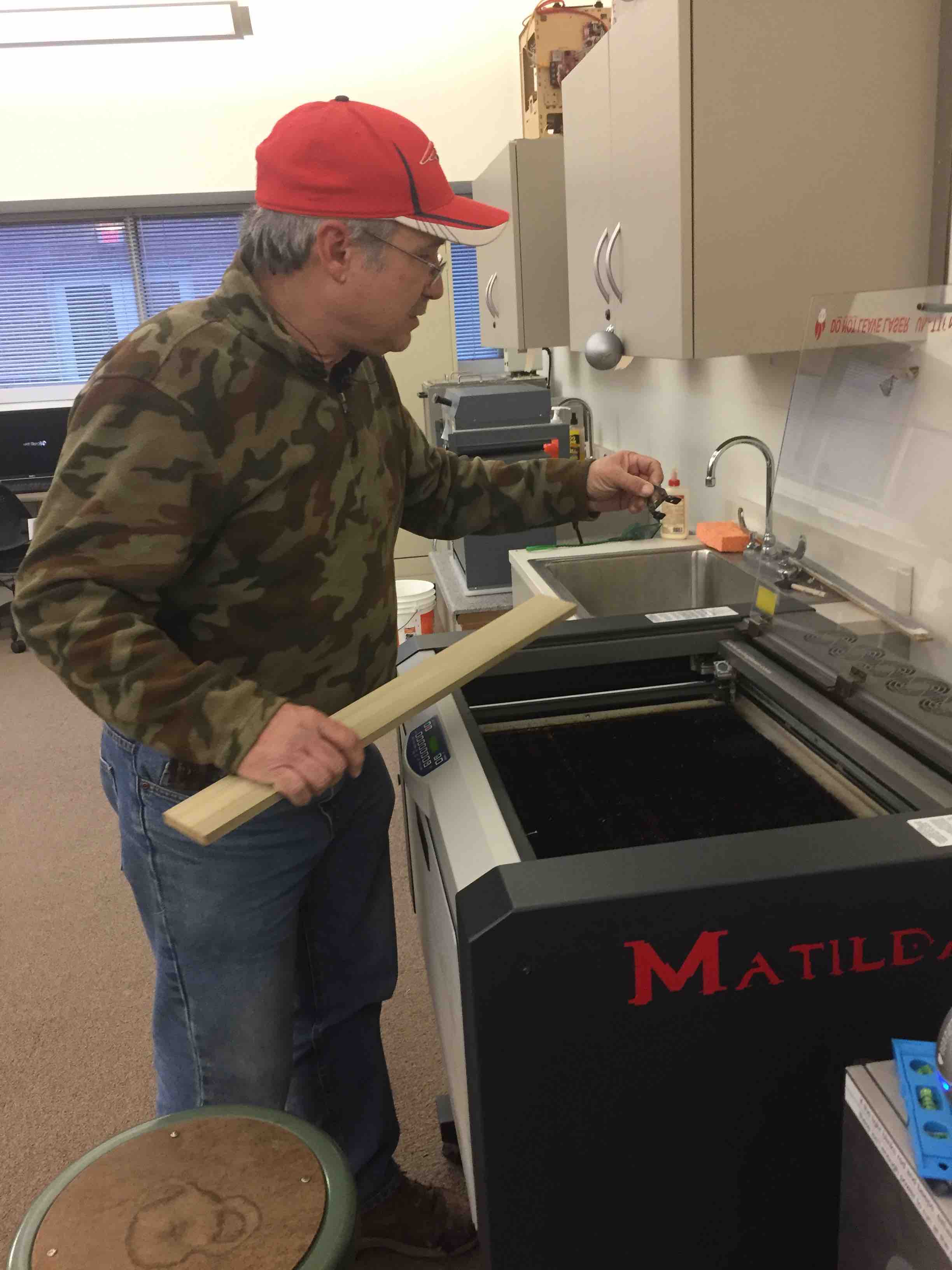 The equipment I used was called "Matilda," an Epilog Helix with a 40 Watt CO2 laser, the larger of two CNC laser cutter/engraving machines available at LCCC.