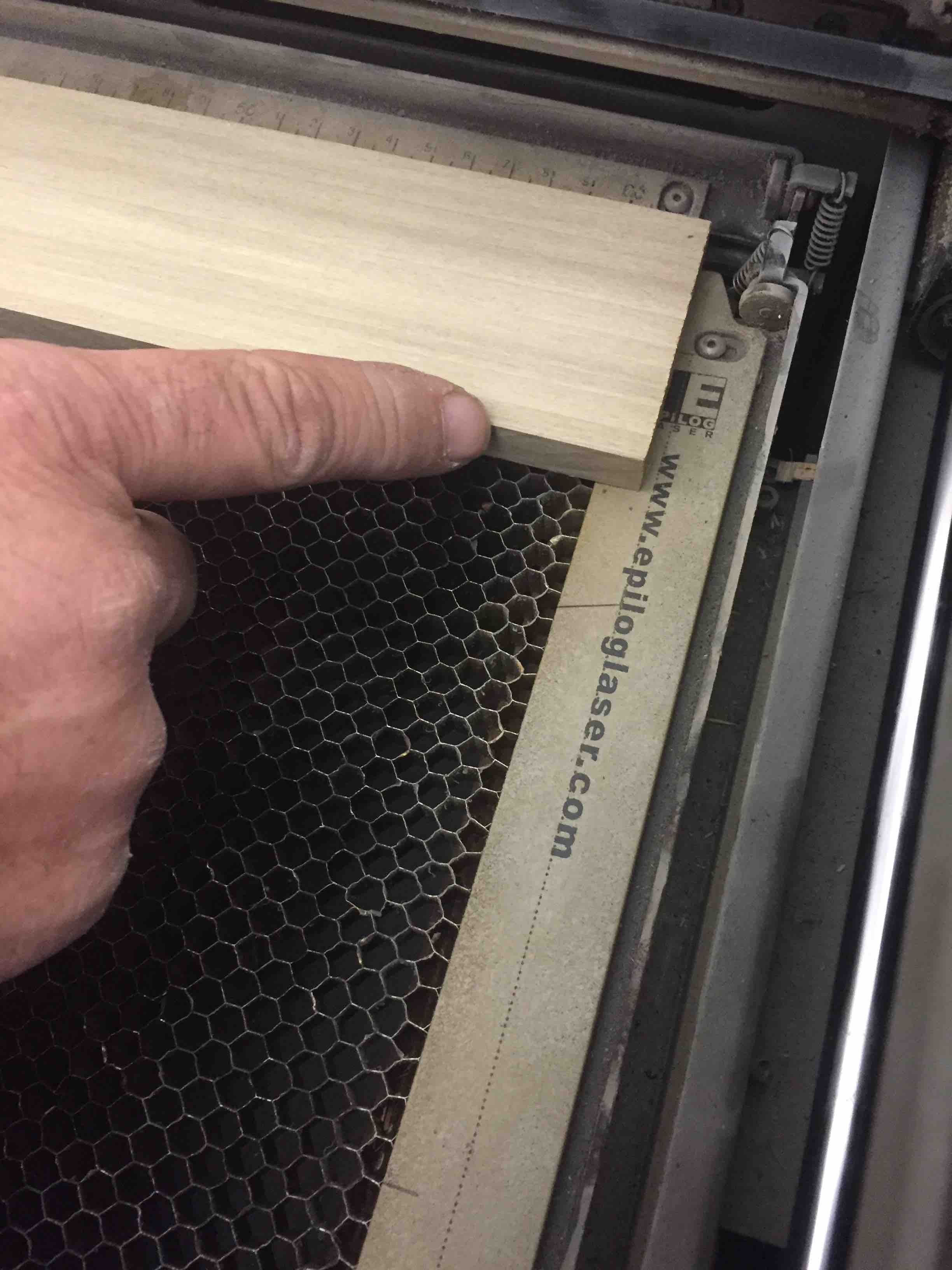 At 2 feet, the piece fits in. The honeycomb under the part helps draw fumes down and out of the laser cutter. The wood extends slightly beyond the honeycomb bed, but well before the end stop. I notice a dotted line on the end plate. I think this may be a physical limit of the machine.