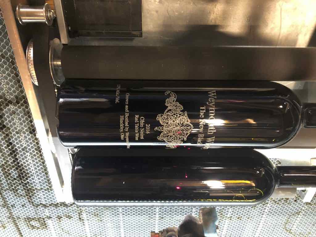 We used the single-bottle rotary axis attachment to engrave the bottle. We did a couple of test bottles and ended up liking the results best when we used 30% power with 150 mm/sec travel speed. After that, we decided to get production rolling. We changed to the 5-bottle roller. Upon further investigation, it turns out the manufacturer neglected to install a 4th axis which is necessary to operate in 5-bottle mode.