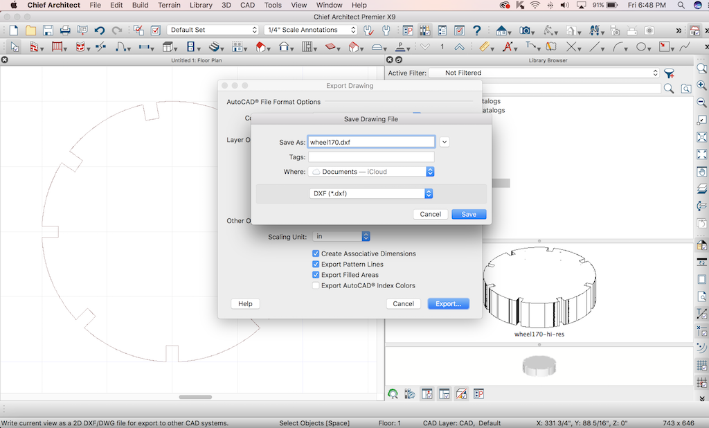 At this point, I decided to call this WHEEL170. I perform "File" - "Export" and will choose DXF as the file type. I had problems with CORELDRAW6 being able to import the latest DXF, so while in Chief Architect, you will need to roll back to Autocad 14 compatibility so Corel can read the resulting file.