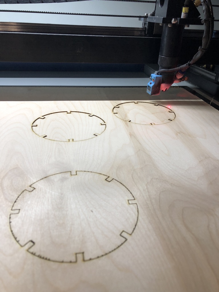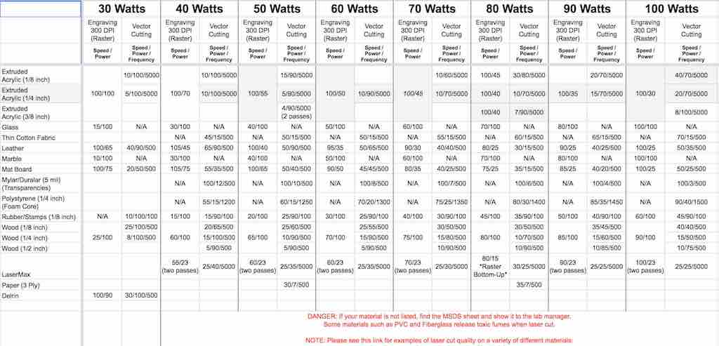 I'm just getting some experience with the machine. Having a large-format laser cutter has some advantages, but also has some drawbacks. You are able to put larger and thicker parts into the machine. However, it is more of a challenge to get parts to lay flat and cut consistently throughout the entire workspace. I have visited Sears Think[BOX], the makerspace at Case Western Reserve University, where they have some large format laser cutters. I found this cutting guide spreadsheet helpful while using my laser. The original sheet is found here: https://docs.google.com/spreadsheets/d/1Dcz3cvCcBPs32yvo-1F11wZ2QqSEchG-daMaAFHtenU/view#gid=0