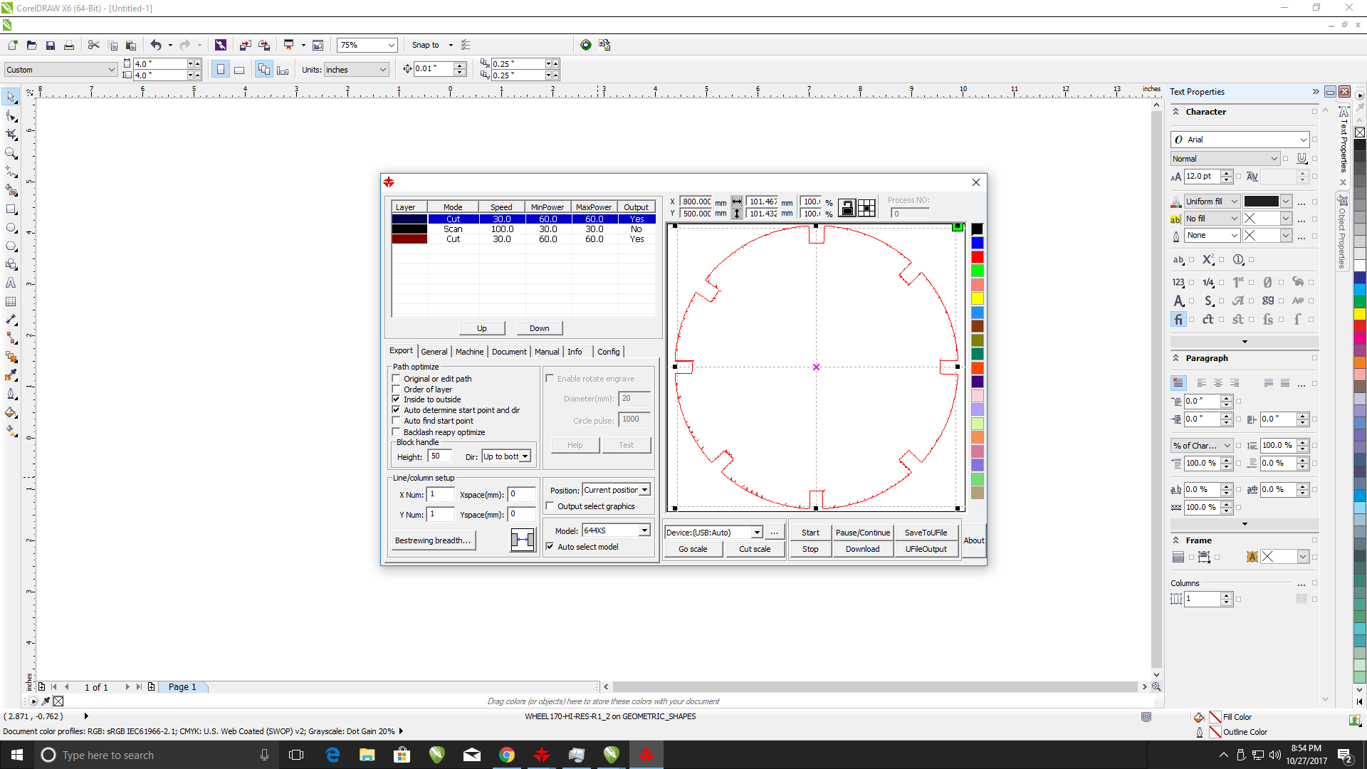 This laser is 175 Watts, so it runs pretty fast travel speed and the power does not need to be set too high. Once your settings are in, press the START button. On this example, I choose to run at 60% power, and 30mm/second. The machine is brand new, so I am still figuring out speeds and feeds.