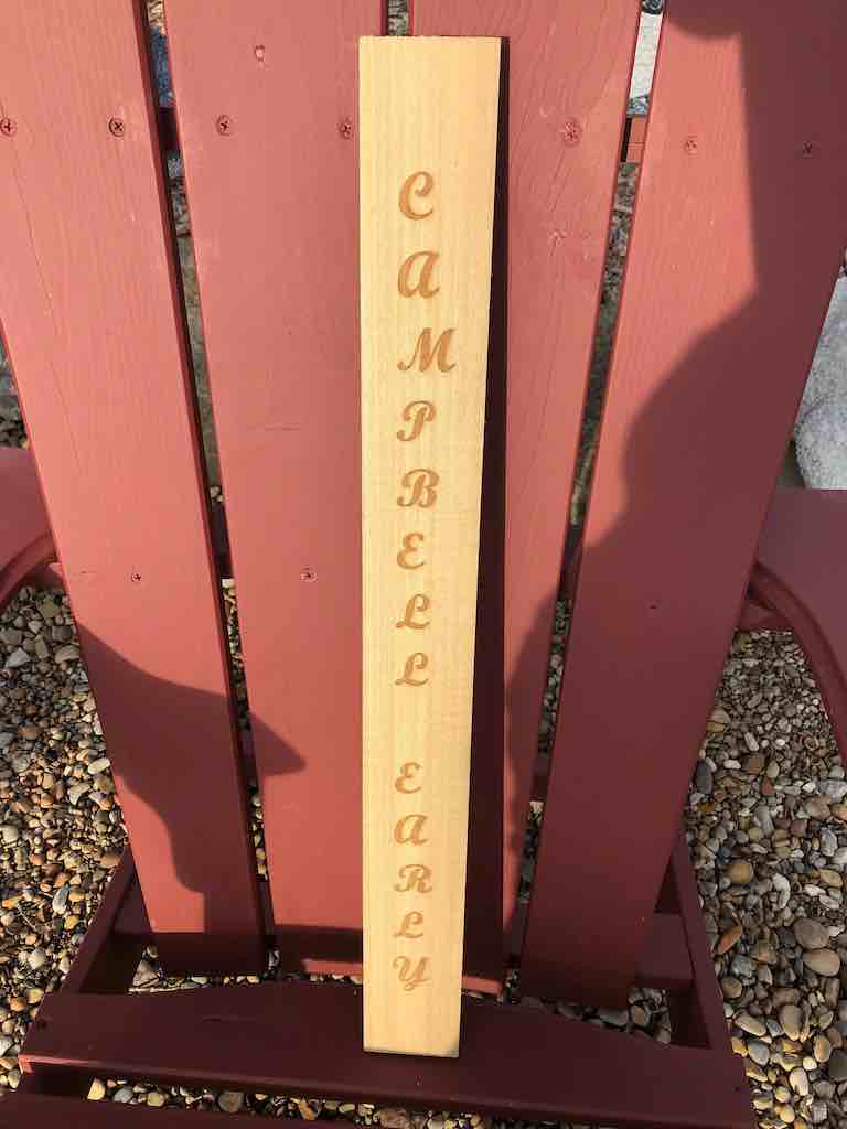It starts to raster cut the wood with the words "Campbell Early". That will make a nice sign for a row of grapes in my vineyard.