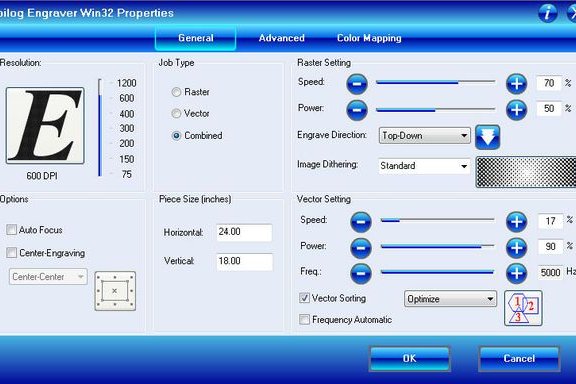 The lab manager also explained that the laser beam head needs to be adjusted up and down to focus beam energy on the part. The machine was already focused for sheet material, so we proceeded to cutting the part. Up to this point, I had never operated a CO2 laser before, so everything was new to me. I learned that many of the functions of the Epilog Laser are controlled through a printer driver purposefully programmed to trigger different features of the laser. This seems rather pathological to me, and I found it to be awkward and confusing. The laser cutter will run in "cut mode" if the image sent to it as a thin line, or "hairline". Otherwise it will "raster" the image which creates an etching or engraving effect. For this example, "hairline" is the correct method in this instance.