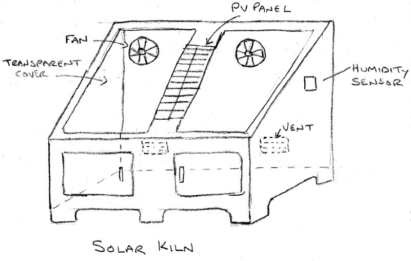 After speaking with my Fab Academy supervisor it was decided that the Stirling Engine stove fan would not be a suitable final project because it would not use enough of the typical Fab Lab equipment and processes. Instead I decided to build a solar kiln which will make use of the Shopbot CNC router, 3D printing and electronics hardware and software. A sketch of the new final project is shown below and the link to the final project page will give more details about it.