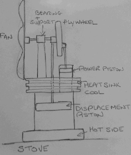 I intend to design and build a Stirling Engine stove fan. I've a wood burning stove and thought about building a thermoelectric driven fan that sits on top of the stove and blows the warm air around the room. However I noticed that some fans were driven by the Stirling Engine which is a purely mechanical device that uses temperature difference to generate fuild (air) movement around a closed system driving pistons which in turn rotate a fan.