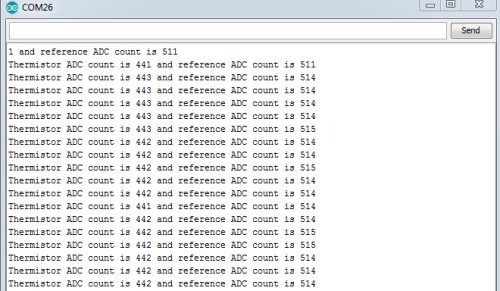 An Arduino program was written that sent the Thermistor ADC value -BRDG1 in the schematic - and the ADC value of BRDG2 - the other side of the bridge circuit - via RS232 to the PC where the values could be checked. I heated up the thermistor to hand temperature and noted that the ADC counts reduced and the count value reflected the measured temperature of approximately 32C.