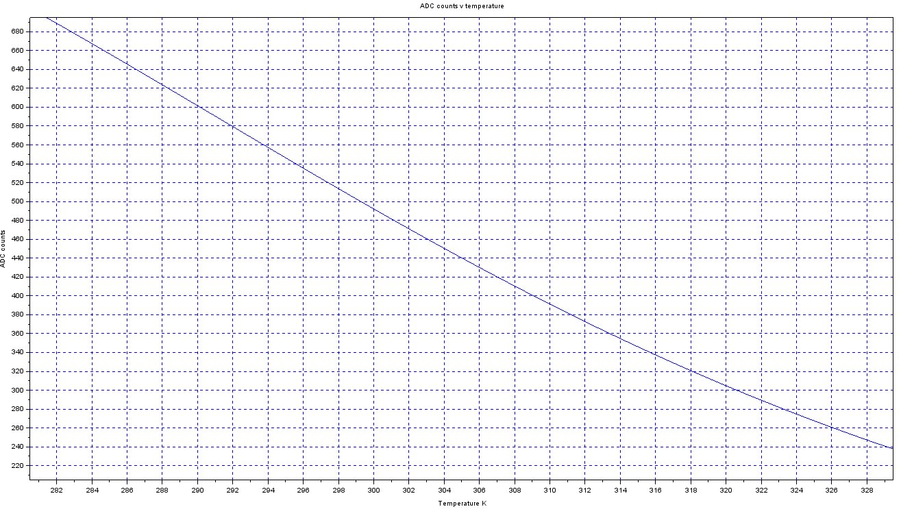 I created a script in Scilab which allowed me to plot the ATtiny44 ADC counts against temperature and used this to determine if my circuit was working. The graph below illustrates the plot results.