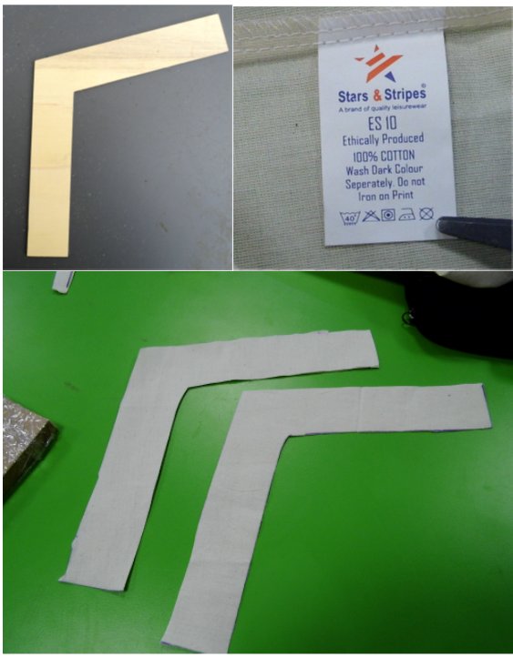 For the fibre part of this composite part I decided to use cotton as this was the nearest suitable material to hand. Along with the mould a seperate wooden part was cut out which would act as the mould press. Finally boomerang shape cotton strips were cut out and these would be placed into the mould. The cotton material, mould press and 2 of the cut cotton strips are shown below.