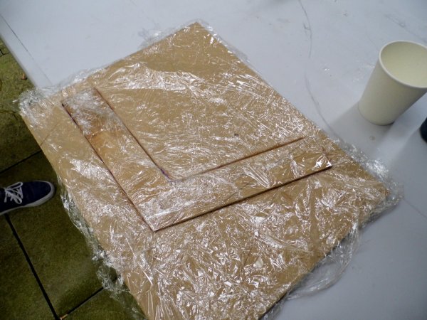 The mould, resin and fibre material were taken outside for ventilation. The mould was covered in 2 layers of cling film as this would stop the resin from sticking to the mould. The resin was mixed with the hardener as per the instructions and a thin film was applied to the base of the mould. A layer of cotton material was placed into the mould and this was painted with a thin film of the resin. This was repeated for the remaing 4 layers of material. Finally the wooden mould press was covered in cling film and placed on top of the mould prior to using the vacuum forming machined to press the whole lot together.