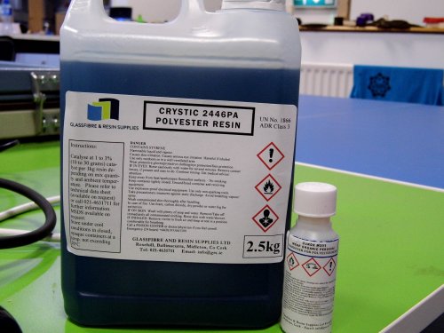 The only resin we could get was Crystic 2446PA Polyester Resin. The materials safety data sheet (MSDS) and the technical data sheet (TDS) for this was studied to understand first of all the health and safety issues with this material and also, how to use it. This material is very dangerous and has to be handled with care. The MSDS and TDS are available for download at the bottom of this page. The hardener for this resin is Curox M303 and the MSDS and TDS are also available in the downloads section.