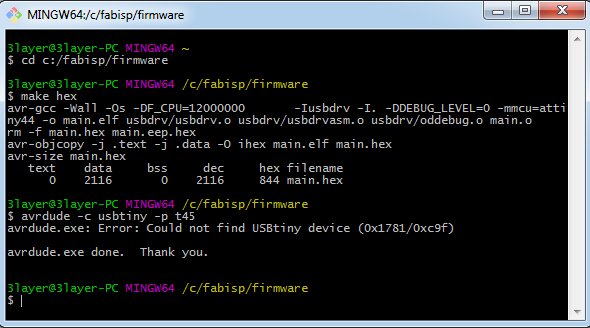 Entering the command Make hex built the firmware but when the programming command avrdude -c usbtiny -p t45 was entered an error message was received indicating the usbtiny device could not be found.