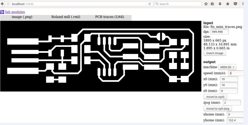 The png file for the programmer board was loaded, with Roland mill selected for output and PCB traces 1/64 picked for the process
