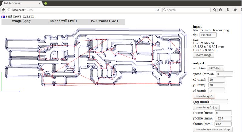 The board was milled out on a Roland Modela MDX-20 using Fab Modules software running on Ubunto 14.04 LTS. Using the terminal application, the working folder was changed to the Fab Modules installation folder. At the terminal prompt the command npm start was entered. The application responded with the following message.