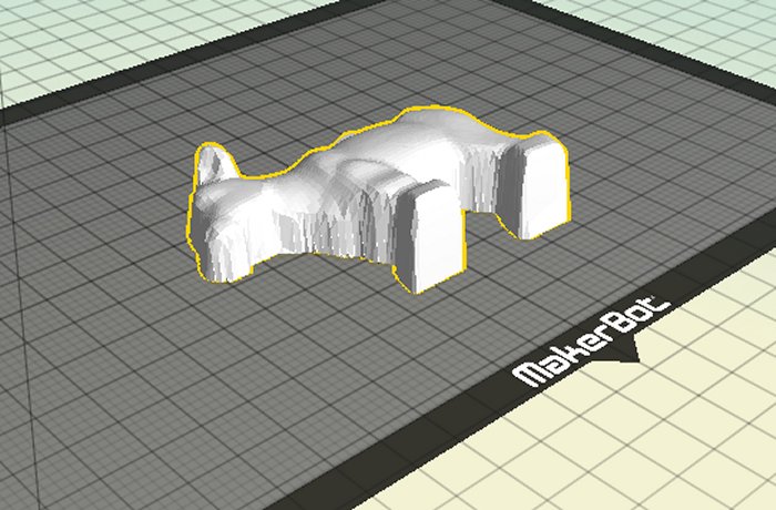 Once the scan has finished the software produces a mesh model of the scanned object which can be exported in a number of various formats. I chose stl and was able to import the scanned model into Makerbot software for printing.