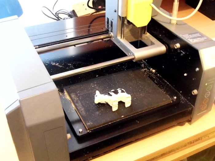 The photo below shows the MDX-20, the piezo sensor and the object to be scanned. The object needs to be firmly attached to the MDX-20 bed. For this I used Blue-Tack.