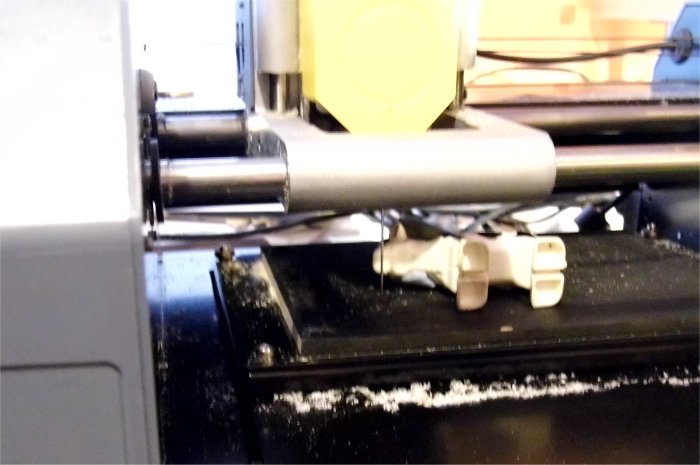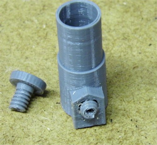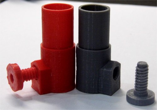 While testing the 3D printers I had printed a pen holder for the Silhouette Cameo 2 which I had downloaded from Thingyverse https://www.thingiverse.com/thing:346734. This uses a 3D printed bolt to screw into a matching threaded receptacle to clamp a pen inside the holding cylinder. When I printed this on the Ultimaker 2+ the bolt screwed into the holder perfectly but when I tried to print it on my CTC Replicator 2 the circular part of the bolt as printed on the XY plane came out as an oval shape while the matching hole in the cylinder wall printed on the XZ plane was ok. Also part of the bolt thread had melted. The picture below shows the two parts. The red part was printed by the Ultimaker 2+ and the grey part by the CTC Replicator 2.