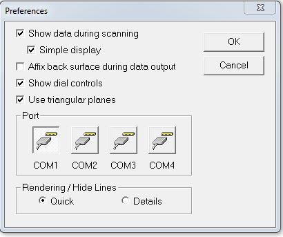 Before scanning can begin the software has to be set up to communicate with the Modela. To do this select File->Preferences and ensure the correct com port is selected. All other settings can remain the same.