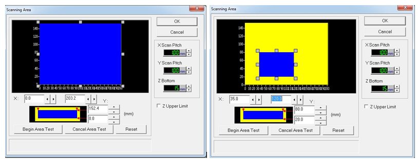 The MDX-20 scanning area is 203x152x60mm and has a resolution of 0.05mm. When scanning objects, the scan area can be reduced to match the size and position of the object. To do this, in the software menu select Control->Scanning Area and drag the small squares at the edges of the blue box to match the object's position and size. Also within the scanning area control the X and Y pitch can be set. This determines how closely together the scanned points are. The bottom of the scanning volume can be set by entering a value into the Z Bottom parameter, which determines how far in the Z direction the piezo probe will descend when scanning.