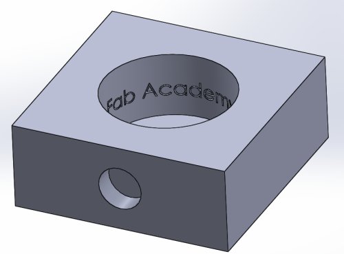 While I don't think the above file can be made using subtractive processes I decided to design another part for 3d printing that would let me test the accuracy of my printer and could only be made using an additive process. The part is a cube 50mm x 50 mm by 20 mm with a 30mm circle cut out on the top and a 10mm circle cut out on one of the sides. On the inner surface of the larger cut out I added the text Fab Academy 2017. A CNC milling machine would be unable to create this text.