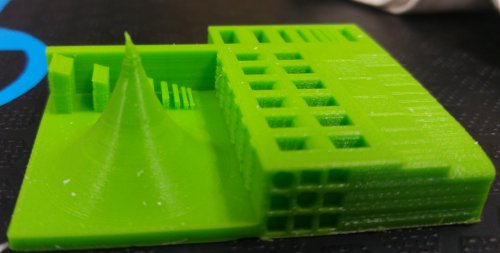 The resultant test print produced a mimimum wall thickness of 0.52 mm and the smallest gap between the walls was 0.59mm. Given the printer nozzel diameter of 0.4mm this represented good resolution, where resolution is the smallest dimensions that can be acurately acheived