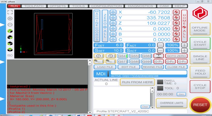 The software used to control the Stepcraft is from UCCNC. The screenshot below shows the test piece file loaded into the software.
