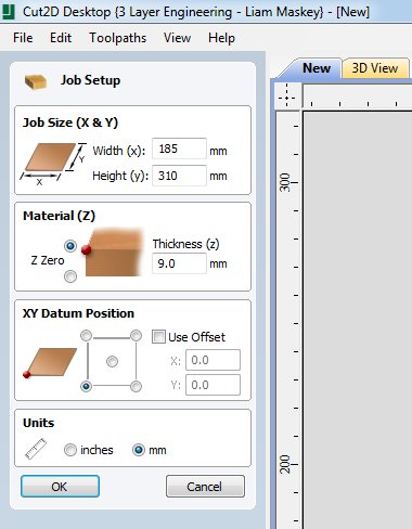 Cut2D comes from the same company, Vectric, that supplies the software for Shopbot so what is written here for Cut2D will apply to Shopbot software. With Cut2D opened I selected File->New and setup the job dimensions to match the size of the piece of plywood that would be cut.