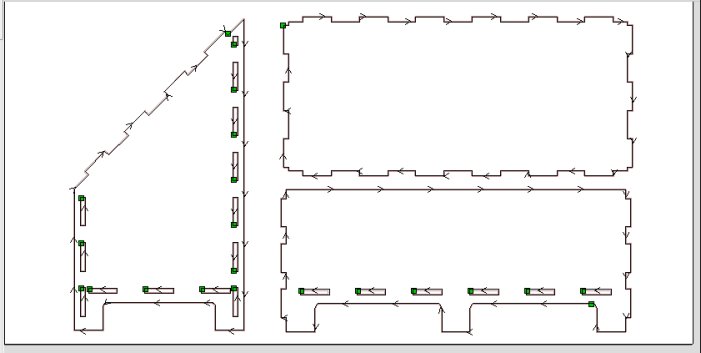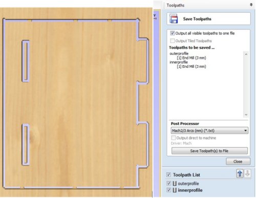 One thing I didn't notice until I had cut two test pieces was that for the outer profile some of the cuts were happening on the inside of the profile with the result that the join fingers were 3mm longer than needed.It was only when I looked closer at the generated toolpath that I observed that some of the paths were placed on the inside of the vectors.