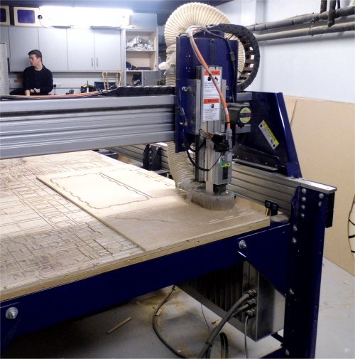 The plywood sheet was screwed to the Shopbot bed and the control software opened. The spindle was moved to the right hand corner of the work piece and zeroed in the software for X and Y. Next the spindle was moved to the centre of the work piece and the Z direction zero plate was used to zero the Z position. The spindle was then sent to the X and Y zero position, the toolpath file loaded and the command to begin cutting sent to the Shopbot. The following image shows the Shopbot cutting out the first set of parts.