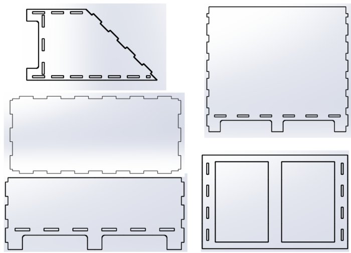I decided to use Solidworks to design the solar kiln. Previously I had used Librecad to produce some prototype drawings and may go back to that software when my Solidworks license expires, however after an initial steep learning curve I found Solidworks intuitive, at least for the uncomplicated design here. The image below shows the main components of the solar kiln. Once the designs had been finalised they were saved as dxfs.