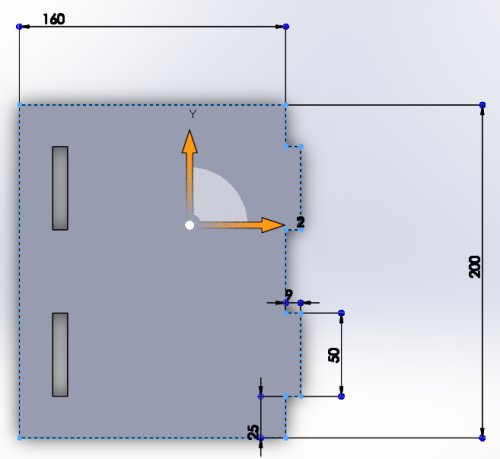 As I am only able to get to the Derry Fab Lab one day per week I decided to use my Stepcraft 420 to generate a test cut. This would give me an idea of how CNC cutting works and allow me to see how accurate the cut out pieces are in relation to the original design. The working area of the Stepcraft 420 is 300 x 420 x 140mm. I drew a test piece in Solidworks which had the dimensions of the two main prototype joints: a 50 mm x 9mm slot and a 50 mm x 9mm finger. The Solidworks design was saved as a dxf which I then imported into Cut2D software. One thing to note, the Solidworks design units have to be in millmetres as Cut2D expects dxf dimensions to be in millimetres. Originally the Solidwork's drawings were in centimetres and the dxfs imported into Cut2D 1/10th of their scale.