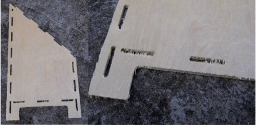 The images below show the assembled prototype. Because the Z position hadn't been setup properly there was some sanding and finishing required on the final parts to allow them to fit together. There was also a problem with the back of the solar kiln as it interfered with the top piece: that is the height of the back piece needed reduced. The prototype also showed that some supporting pieces need included in the design to increase strength and rigidity. Finally, the joints are too tight and they needed some sanding to get then to mate with the slots.