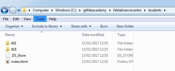 Using Windows Explorer I created a folder in my C drive. This was called gitfabacadmeny. I have had problems with names containing upper case so recommend all folders and files be lower case.
