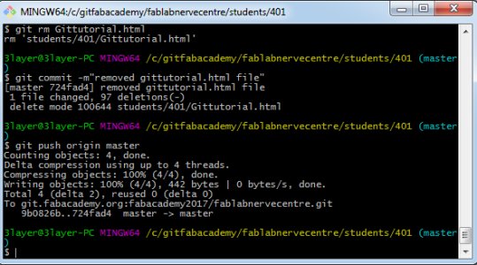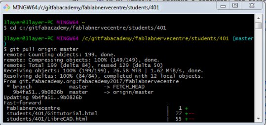 For Fab Academy 2017 each of the participating FabLabs hosts a Git repository on GitHub. Students of a participating Fab Lab are required to first of all clone their Lab's GitHub repository onto their local computer. Then any files the student creates or changes are pushed back to the GitHub repository maintaining an accurate and current store of all that student's work and any of their colleagues. To ensure remote and local repositories are up to date it is required that students regularly pull (download) and push (upload) to the remote repository.