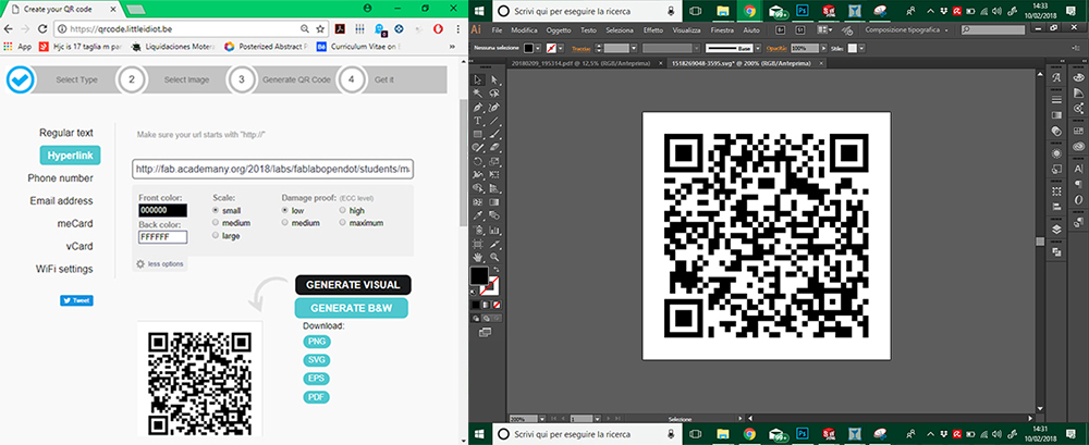 For first point of individual assignement I decided to create a Qr Code of my personal Fab Academy web site, and cut it on the vinylcutter. I think to put my Qr Code on my lamp base by engraving, but for now, I want try to cut a vinyl one and use it as stencil mask on a piece of MDF. For do this I've genereted a static Qr code on "qrcode.littleidiot", and saved it in "eps" file. Then I've opened the Qr Code in Illustrator, just for ensure that the vectorial lines was very perpendicular and cleaned.